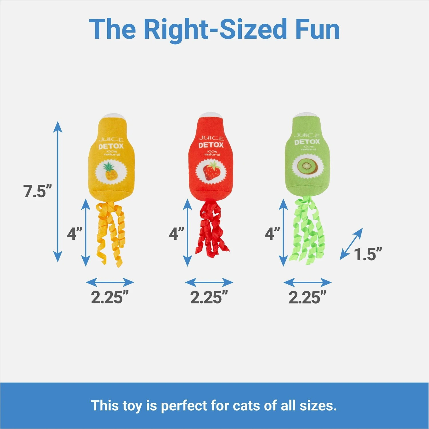 - Juice cleanse plush cat toys include catnip and crinkle paper to amp up playtime and get kitty moving.